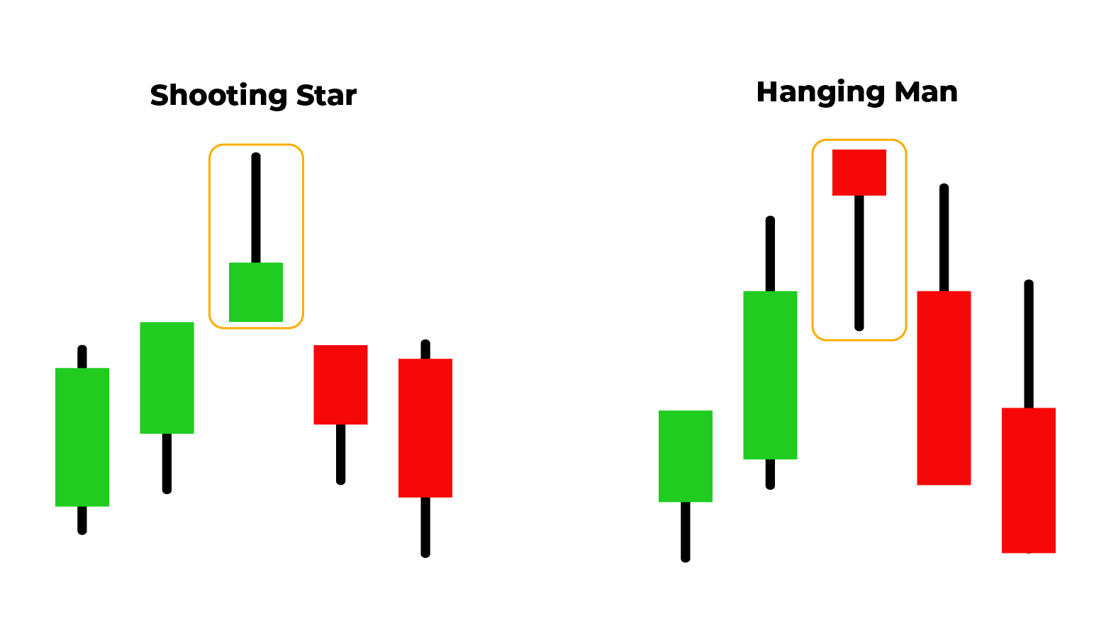 Shooting star mirip inverted hammer tapi muncul di puncak tren naik, menandakan potensi pembalikan turun. Hanging man mirip hammer tetapi muncul di akhir tren naik dan mengindikasikan kemungkinan pembalikan turun.