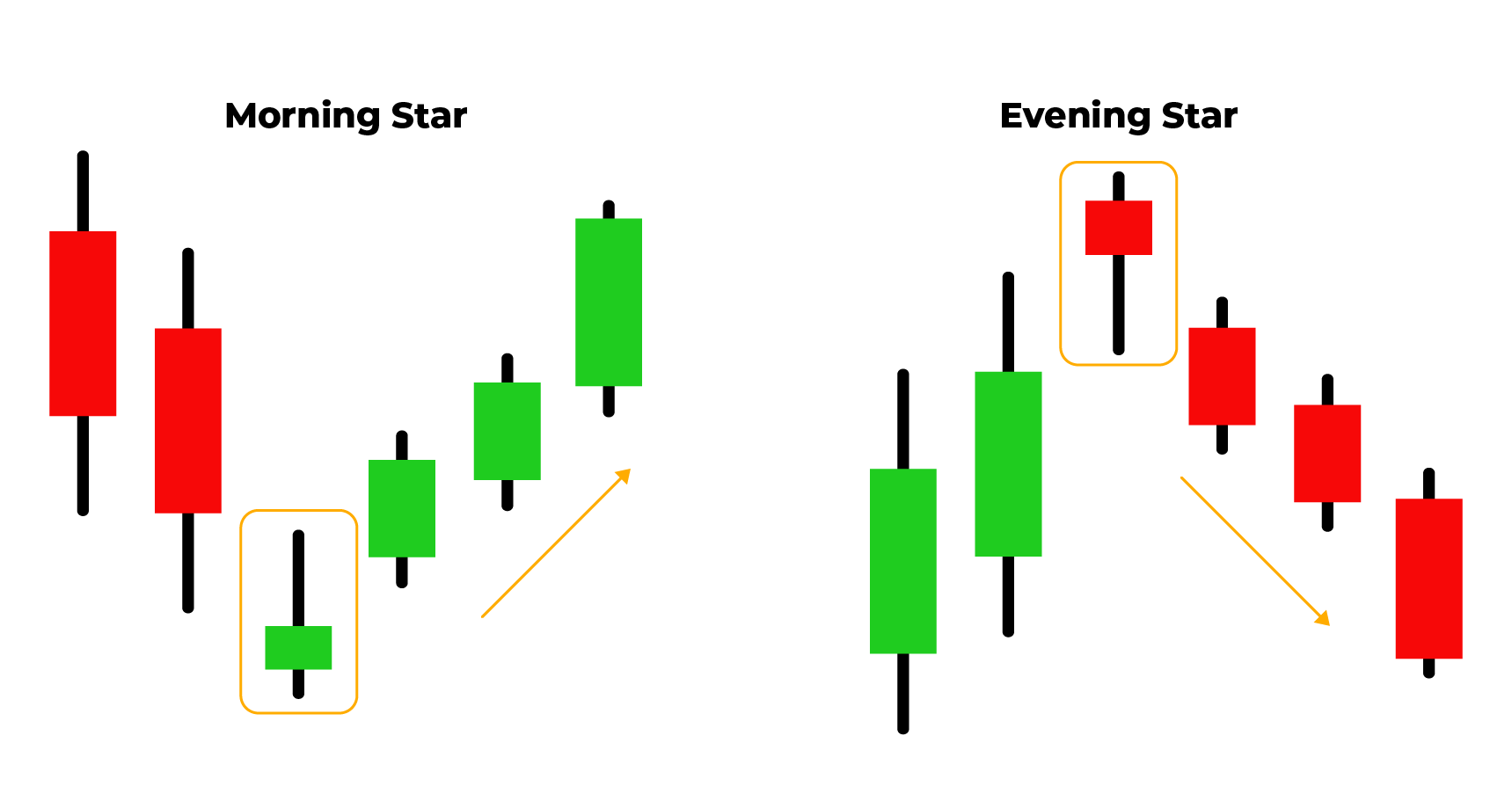 Morning star adalah pola tiga candle: bearish → doji/kecil → bullish, menandakan pembalikan bullish. Evening star kebalikan morning star: bullish → doji/kecil → bearish, menandakan pembalikan bearish.
