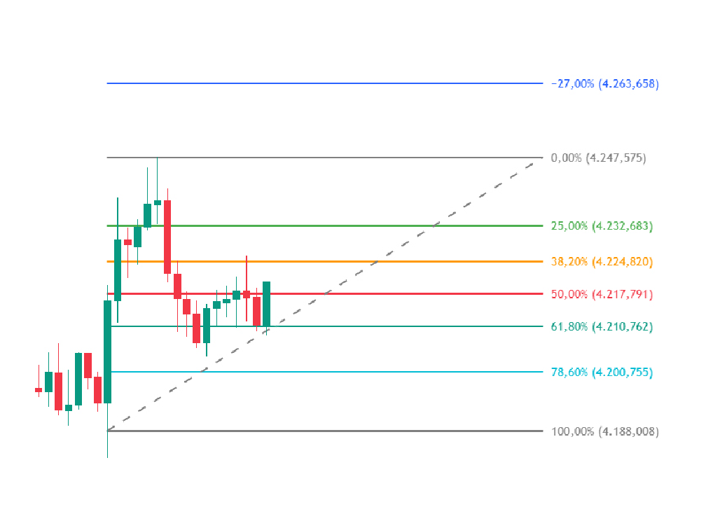 Secara otomatis akan muncul garis-garis horizontal yang menunjukkan level Fibonacci, yaitu 23,6%, 38,2%, 50%, 61,8%, dan 76,4%.
