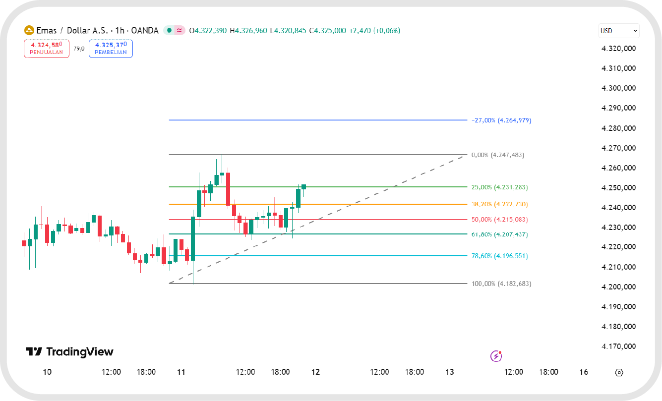 Jika harga naik dari 1.000 ke 1.100, lalu mulai terkoreksi turun, trader bisa memperhatikan area Fibonacci retracement di 1.061 (38,2%), 1.050 (50%), dan 1.038 (61,8%) sebagai area pantulan potensial.