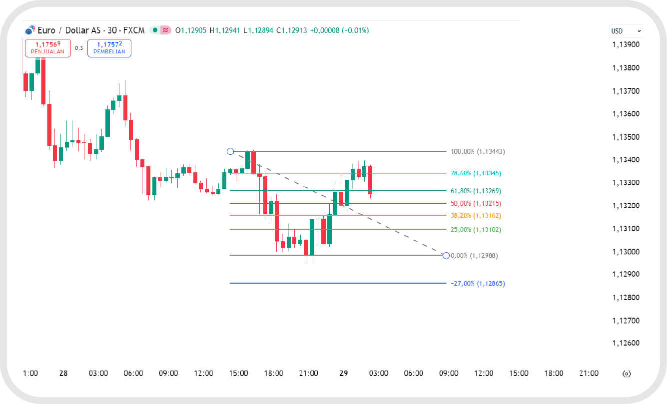 Dalam downtrend: Harga sering terkoreksi naik dulu sebelum melanjutkan penurunan. Level 38,2%, 50%, dan 61,8% sering menjadi area resistance tempat harga tertahan sebelum turun lagi.